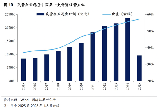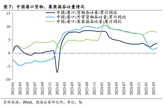 出口展现超预期韧性。面对单边主义、保护主义抬头,国际经贸秩序遭受严重冲击的外部形势,中国外贸顶住压力持续增长。1-5月份,货物进出口同比增长2.5%,出口同比增长7.2%。从主要港口情况看,1-4月全国20大主要港口货物吞吐量逐月均高于2024年同期。总体看,贸易结构有三大亮点:一是贸易主体多元化。尽管对美进出口有所下降,但对于东盟、欧盟、共建“一带一路”国家进出口保持增长。中国对美国出口占比自2018年的19.2%降至2025年5月的11.9%,同期对东盟出口占比由12.8%升至17.8%。2025年1-5月,我国与东盟、欧盟、共建“一带一路”国家进出口额分别增长9.1%、2.9%、4.2%,共建“一带一路”国家占我国进出口比重达51.5%。二是出口产品多元化。今年1-5月,我国机电产品出口额同比增长9.3%,占出口总额的比重为60.0%。三是民营企业成为外贸主体的中坚力量。2025年1-5月,我国民营企业进出口同比增长7%,占进出口总额的比重为57.1%,比上年同期提高2.4个百分点。其中出口增长8%、进口增长4.9%,都明显好于全部外贸进出口。