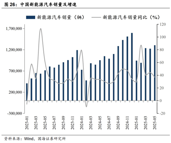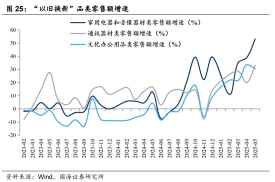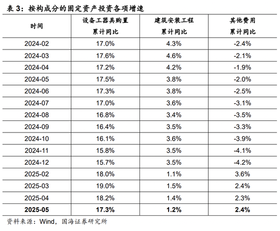 二是设备更新持续发力,带动投资有效增长。今年1-5月设备工器具购置投资增长17.3%,对投资增长的贡献率超过60%。从支持力度和范围看,今年中央财政安排超长期特别国债资金2000亿元用于支持设备更新,较去年增加500亿元。同时根据年初发布的《关于2025年加力扩围实施大规模设备更新和消费品以旧换新政策的通知》,今年在支持范围上进一步拓展了电子信息、安全生产、设施农业等领域;针对相关贷款,除了中央财政贴息1.5个百分点外,国家发展改革委安排超长期特别国债资金进行额外贴息;此外,针对老旧营运船舶、老旧营运货车和农业机械、新能源城市公交车及动力电池等领域支持政策进一步优化调整。4月28日,国家发展改革委表示扩大投资方面,将工业软件等更新升级纳入“两新”政策支持范围。从金融政策角度,5月7日,中国人民银行表示为支持科技创新和技术改造,央行将增加3000亿元科技创新再贷款额度,总额度从5000亿元提升至8000亿元。地方上关于设备更新的配套措施持续细化完善,如4月河南省出台相关方案,提及到2025年底,推动老旧营运货车报废更新约4700辆、农业机械报废更新1.8万台套,新能源城市公交车更新800辆、动力电池更新4500台。针对设备更新贷款,在中央财政贴息的基础上,按照贷款本金的1%给予省级财政贴息。