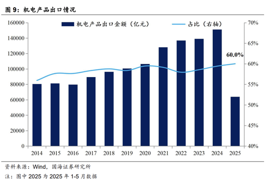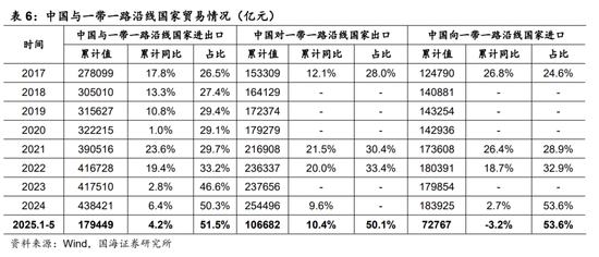 贸易主体多元化。尽管对美进出口有所下降,但对于东盟、欧盟、共建“一带一路”国家进出口保持增长,体现出我国外贸多元化发展的积极成效。中国对美国出口占比自2018年的19.2%降至2025年5月的11.9%,同期对东盟出口占比由12.8%升至17.8%。2024年,共建“一带一路”国家占我国进出口比重首次超过50%。2025年1-5月份,我国与东盟、欧盟、共建“一带一路”国家进出口额分别同比增长9.1%、2.9%、4.2%,共建“一带一路”国家占我国进出口比重进一步提升至51.5%。