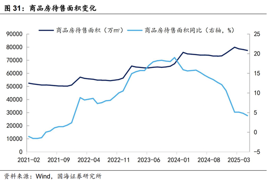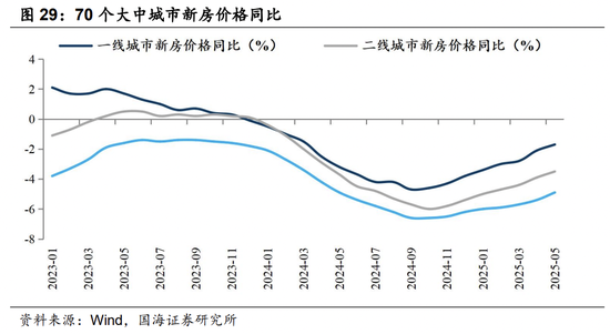 政策支持下市场止跌回稳。自2024年9月中央政治局会议首次明确“促进房地产市场止跌回稳”以来,企稳迹象初现。2025年6月国常会进一步部署“更大力度推动房地产市场止跌回稳”,政策连贯性强化市场预期。销售面积较2024年有显著修复,2025年1-5月,新建商品房销售面积和销售额同比分别下降2.9%和3.8%,2024年同期为下降20.3%和27.9%。价格同比跌幅收窄,2025年5月,70个大中城市新房、二手房价格同比降幅连续收窄,新房一、二、三线城市较1-4月分别收窄0.4、0.4、0.5个百分点。二手住宅销售价格同比降幅较1-4月分别收窄0.5、0.4和0.5个百分点。库存持续去化,商品房待售面积连续3个月减少。但5月各线城市销售价格环比下降,说明市场全面回稳仍需政策持续巩固。