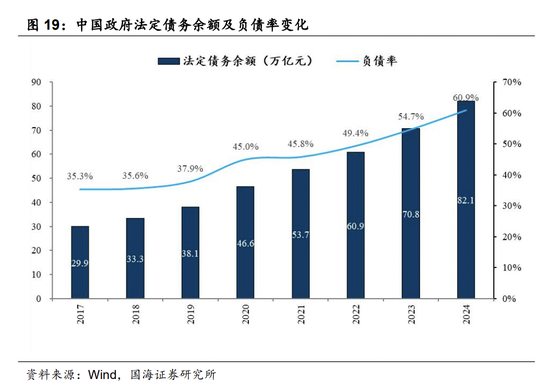 未来,中国政府仍有较大举债空间。根据IMF统计数据,2024年末G7国家平均政府负债率123.2%,日本236.7%、意大利135.3%、美国120.8%、法国113.1%、加拿大110.8%、英国101.2%、巴西87.3%、印度81.3%、德国63.9%。截至2024年末,中国政府部门法定债务余额82.1万亿元,负债率为60.9%,显著低于主要经济体和新兴市场国家。