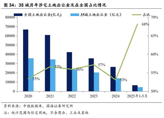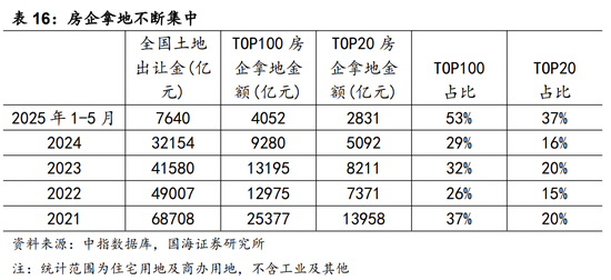 供给侧土地市场进入“双集中”时代。当前土地市场热度集中于35个一二线城市和20家房企。据中指数据库统计,2025年1-5月,重点35城涉宅土地出让金占比全国的68%。2025年1-5月,TOP100房企拿地总额4052亿元,同比增长28.8%,TOP100房企拿地金额占比全国土地出让金的53%,其中权益拿地金额TOP20房企拿地金额占比全国土地出让金37%。未来土地市场热度能否延续,主要取决于五大关键因素:融资环境能否进一步改善、新房市场成交量能否持续企稳、市场库存能否有效去化、房地产新模式下的销售模式变革,以及供地规则的优化调整。