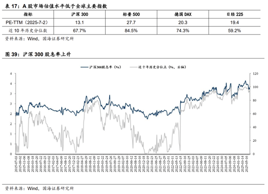 A股有望延续震荡上行趋势。第一,政策高度重视资本市场稳定。股市稳定关乎经济社会大局、关乎亿万投资者切身利益。2024年9月,政治局会议强调努力提振资本市场。2024年12月,政治局会议提出“稳住楼市股市”。2025年4政治局会议强调,持续稳定和活跃资本市场。体现政策层面维护市场稳定的坚定决心。第二,A股市场估值水平处于相对低位,配置价值凸显。截至7月2日,沪深300市盈率只有13.1,处于近10年历史分位点的67.7%。而标普500市盈率27.7,处于近10年历史分位点的84.5%。德国DAX、日经225市盈率分别为20.3、19.4。由此可见,国内市场指数市盈率明显低于全球主要指数。当前,全球资本市场不稳定因素增多,国内资产配置价值开始逐步凸显。第三,A股市场“科技叙事”逻辑下,资金集聚效应逐步加强。当前,我国新质生产力、科技和产业创新发展势头正盛,国际贸易摩擦倒逼国产替代加速。公募基金、外资等长期资金持续增配我国科技资产。随着下半年美联储降息预期的增强,全球流动性压力缓解,预计会有更多资金流入国内资本市场。第四,回购分红等制度增强市场韧性。针对回购,2024年10月,央行推出股票回购增持再贷款工具,通过向金融机构提供低成本资金,激励其向上市公司及主要股东发放贷款,支持回购和增持行为。截至今年6月末,已有超630家上市公司获银行股票回购增持贷款支持,按贷款金额上限计算,总金额超1300亿元。针对分红,政策推动上市公司强化投资者回报,提高上市公司投资价值。2024年A股分红达到2.4万亿元,创历史新高。截至7月2日,沪深300股息率3.2%,处于近10年历史分位点的92.4%,红利价值凸显。
