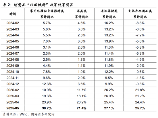 二是“以旧换新”政策持续显效。2025年消费品以旧换新政策在家电领域覆盖范围扩展为“12+N”类,新增微波炉、净水器、洗碗机、电饭煲4类产品,同时地方可以结合实际情况增加品类;在汽车领域适当扩大符合条件的汽车报废更新旧车范围;在数码产品领域,首次实施手机、平板、智能手表(手环)等产品的购新补贴。根据商务部数据,截至5月31日,2025年消费品以旧换新5大品类合计带动销售额1.1万亿元,发放直达消费者的补贴约1.75亿份。今年5月份,限额以上单位家用电器和音像器材类、通信器材类、文化办公用品类、家具类商品零售额同比分别增长53%、33%、30.5%、25.6%,合计拉动社会消费品零售总额增长1.9个百分点,比4月提高0.5个百分点。政策不仅直接带动相关消费品销售额显著提升,还积极推动相关消费品结构升级和相关产业链转型跃升。