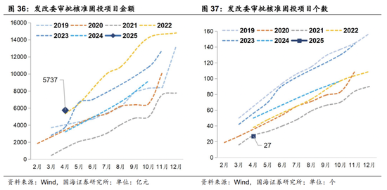 一是发改委审批核准固投项目金额处于同期历史高位,为下半年基建投资增长提供有力支撑。今年1-4月,共审批核准项目27个,总投资高达5737亿元,主要集中在能源、农林水利、高技术等关键领域,且项目规模高于2019-2024年同期水平。充足的项目储备,将随着建设推进带动配套资金与社会资本加速流入,保障投资持续增长。