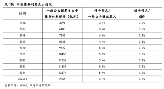 从利息支出看,债务空间大。达利欧在《债务危机》中提及,债务是不是问题,关键取决于能否用于生产性目的并形成有效资产,直接或间接地创造出足够多的收益来还本付息。债务工具本身是一种金融债权,要求债务人在约定时间里向债权人还本付息,如果债务人能在不需要额外财政援助或不违约的情况下履行其当前和未来的所有支付义务,则债务可持续。对于政府来说,尤其是利息刚性支出,决定了举债空间范围。2024年,我国一般公共预算支出中债务利息支出1.3万亿,与一般公共财政收入比值为5.9%、与GDP比值为1.0%,而美国的债务利息支出与财政收入比值17.9%、与GDP比值为3.0%。