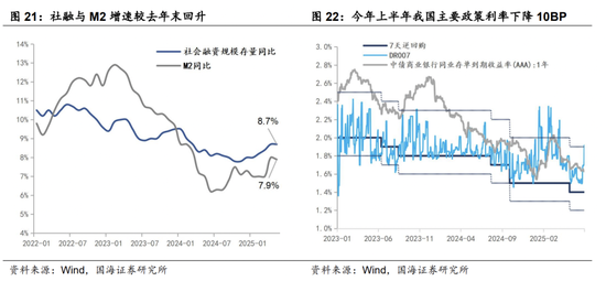 货币政策时隔14年重新定调“适度宽松”。上半年央行通过总量与结构性工具协同发力,实施1次降准、1次降息,下调支农支小再贷款等结构性货币政策工具利率及个人公积金贷款利率25BP,新增3000亿元科技创新和技术改造再贷款额度,设立5000亿元服务消费与养老再贷款,新增3000亿元支农支小再贷款额度并合并两项资本市场支持工具额度。政策发力见效,截至5月末,社融同比增长8.7%、M2同比增长7.9%,较上年末分别回升0.7和0.6个百分点。