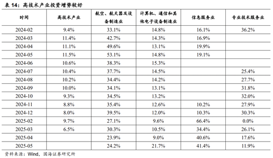 投资向“新”发力。2025年政府工作报告部署“积极扩大有效投资”系列工作,提出“建立未来产业投入增长机制”,强调“推动科技创新和产业创新融合发展,大力推进新型工业化,做大做强先进制造业,积极发展现代服务业,促进新动能积厚成势、传统动能焕新升级”。今年1-5月,高技术产业投资中,信息服务业,航空、航天器及设备制造业,计算机及办公设备制造业,专业技术服务业投资同比分别增长41.4%、24.2%、21.7%、11.9%,增速显著高于其他投资。