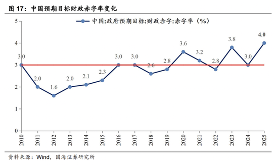 2025年财政政策更加积极、更加给力。一是赤字安排力度更大。今年财政赤字率按4%安排,赤字规模达5.66万亿元,比去年增加1.6万亿元,赤字水平和规模均为近年最高。二是政府债券规模更大。今年新增地方政府专项债券4.4万亿元、比上年增加5000亿元;发行超长期特别国债1.3万亿元、比上年增加3000亿元;发行首批特别国债5000亿元,积极支持国有大型商业银行补充核心一级资本;发行弥补赤字的国债5.66万亿元、比上年增加1.6万亿元。三是财政支出强度更大。今年全国一般公共预算支出29.7万亿元,比去年增长4.4%,财政支出进一步扩张。今年新增政府债券规模达到11.86万亿元,比去年增加2.9万亿元。按2025年政府工作报告里的5.66万亿预算赤字和4%的预算赤字率计算,2025年名义GDP为141.5万亿元。11.86万亿元广义赤字(5.66万亿元赤字+4.4万亿元专项债+1.8万亿元特别国债)对应的广义赤字率则为8.4%,较去年的6.6%大幅增加了1.8个百分点。