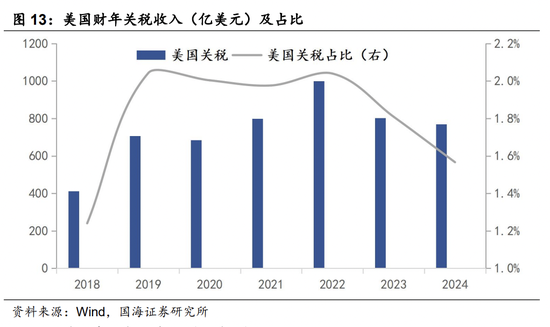 经济层面,关税增加财政收入,搭配国内减税政策,实现税收替代。4月4日,美国财政部长贝森特接受专访,详细解释了关税制度的背景、目的以及它如何帮助重新平衡美国经济。贝森特提及“如果我们可以征收20%的关税,并用这笔钱来降低我们的政府赤字并保持低税率,这是一个非常独特的方案”。“总统以行政权力这样做(征收关税),资金会流入,用于支付总统的许多承诺,包括对小费不征税、对社会保障不征税、对加班不征税、对美国制造的汽车进行利息扣除”。2024财年美国关税收入约770.4亿美元,占财政收入的比重为1.57%。美国5月关税收入突破222亿美元,创单月新高。