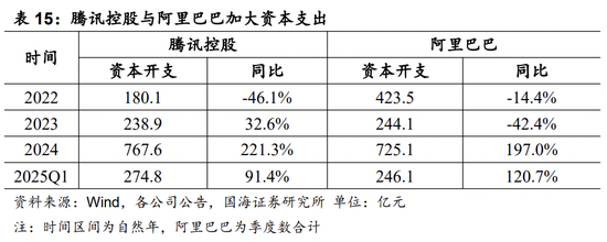 四是充分调动民营经济积极性,民间科技投资边际好转。5月20日《中华人民共和国民营经济促进法》正式施行,以法律形式明确了民营经济的重要地位。头部企业加大科技投入,腾讯2025年一季度资本开支274.8亿元,同比大增91%;阿里巴巴2025财年资本开支859.7亿元,同比增长168%。