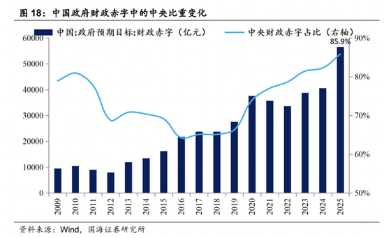中央显著加杠杆。一是中央赤字规模扩大。2025年,中央赤字为4.86万亿元,占比85.9%,为近年来最高水平。二是优化债务结构,中央债务占比提高。新增政府债务11.86万亿元中,中央政府发行6.66万亿元,包含1.8万亿特别国债和4.86万亿中央赤字,占比约56%,较2024年的48.4%显著增加。三是国债发行加速。今年上半年,国债净融资额3.4万亿元,占全年6.66万亿额度的50.8%,较去年上半年35.8%的进度显著加快。四是加大地方转移支付力度。今年中央对地方转移支付安排为10.3万亿元,同口径增长8.4%。截至今年5月,中央对地方转移性支出已达50726亿元,进度为49.1%。