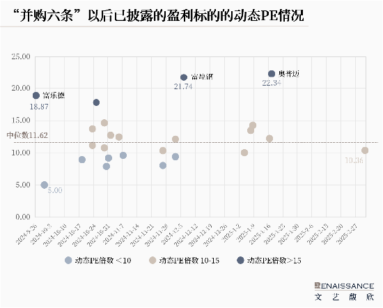 就进入草案阶段并披露盈利标的动态PE(标的整体估值/业绩承诺期平均净利润数)来看,盈利标的的动态PE对应中位数数值为11.62倍,现已披露草案的上市公司收购盈利标的的动态PE仍显得较为克制。具体来说,24起中有20起标的动态PE在15倍以下,其中7起动态PE在10倍以下;4起标的动态PE在15倍以上,动态PE最高的3起均为收购拟IPO/撤否企业,分别为奥浦迈(688293.SH)公告收购的澎立生物,是国内最早聚焦于创新药研发临床前药效学研究评价的CRO公司之一,对应动态PE为22.34倍,目前已获交易所受理;富煌钢构(002743.SZ)公告收购的中科视界,是国内高速视觉技术领域的领军者,对应动态PE为21.74倍,目前已终止相关交易;富乐德(301297.SZ)公告收购的富乐华100%股权,是一家从事功率半导体制造所用的覆铜陶瓷载板的研发、生产和销售的企业,对应动态PE为18.87倍,目前已获得证监会同意批复。