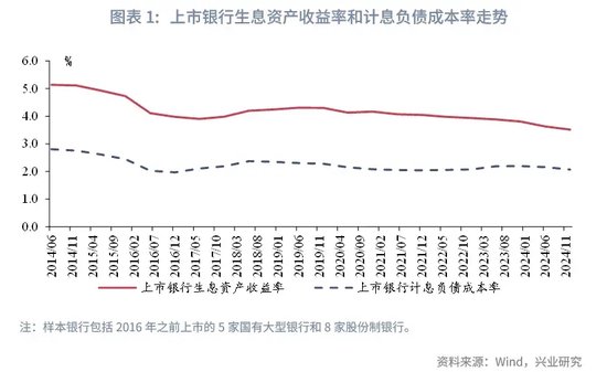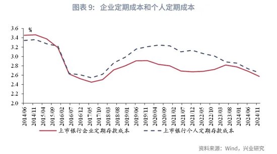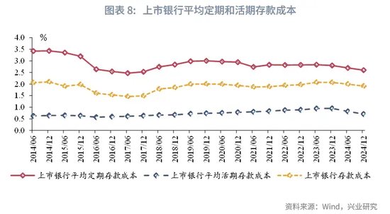 存款成本方面,2019年至2024年,存款成本长期保持在1.90%-2.00%之间,主要是由于存款利率下调幅度低于贷款利率、存款定期化、存款“手工补息”等原因。规范存款手工补息后,企业存款成本有所下行,但企业存款定期化比例再度上升。