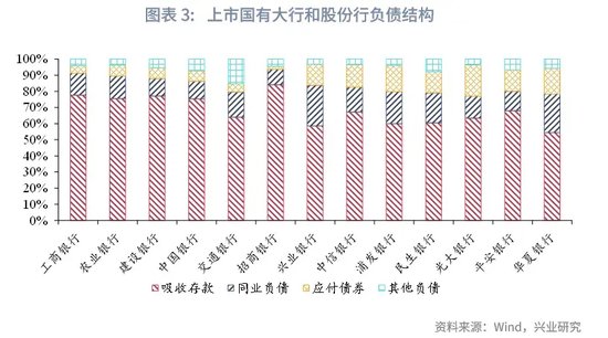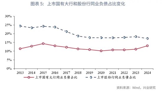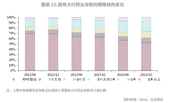 自2022年开始,同业存款出现了定期化趋势,且平均期限拉长;同业存款定价自律后,同业存款的定期比例进一步提升。这可能有两方面原因:一是2022年现金管理类产品整改、可以配置的NCD期限缩短,长久期同业存款在彼时扮演了替代作用;另一方面,随着中长期贷款持续投放、政府债发行期限拉长,国有大行银行账簿利率风险指标压力上升,银行对长久期负债的需求持续上升。2024年11月末,自律机制规范非银存款定价后,非银活期存款参考7天逆回购利率定价。根据上市银行2024年报披露,2024年全年的同业负债成本为2.38%,较2024年上半年下降16bp,不过,同业存款中的定期存款占比进一步提升。