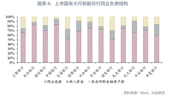 从负债结构来看,国有大行2024年以来同业负债占比有所上升。从上市国有大行和股份行的负债结构来看,国有大行存款占比多数超过70%,而股份行存款占比多数在60%-70%左右;国有大行同业负债占低于股份制银行,但自2024年以来,国有大行同业负债占比(不含NCD,下同)已经从11%左右提升至13%左右,而股份行同业负债占比反而从18%左右下降自17%左右。在同业负债的构成中,多数银行同业存款占比在60%-80%,其余为拆入资金和回购融入。