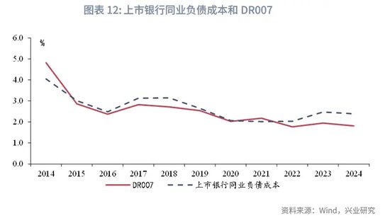 综合以上分析可以看出,尽管2022年之后存款挂牌利率下调,但平均存款成本较为刚性,保持在1.90-2.00%的水平;而同业负债同样出现了定期化现象、应付债券成本率下行则存在重定价相对缓慢的制约,导致银行的计息负债平均成本率并未跟随政策利率下行、甚至一度上行,2024年,上市银行的计息负债成本率为2.07%,基本与2021年持平。