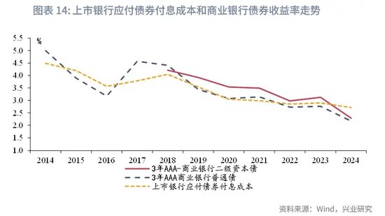 上市银行应付债券平均付息成本和商业银行债券收益率曲线的走势较为一致。从上市银行应付债券的付息成本来看,和3年AAA商业银行普通债的收益率走势较为一致。需要指出的是,商业银行报表显示的应付债券付息成本,是存续债券的平均付息成本,因而相较于市场利率存在一定的滞后性,在2024年债券收益率下行较快的时点,付息成本的下行滞后于债券收益率曲线。