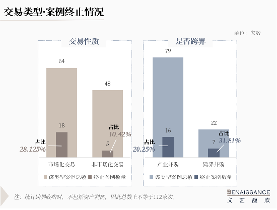 从案例终止情况看,目前大部分终止的案例都是市场化交易,失败率28.125%。产业并购类型的终止案例数量虽然高于跨界并购,但从失败率看,跨界并购要略高于产业并购。