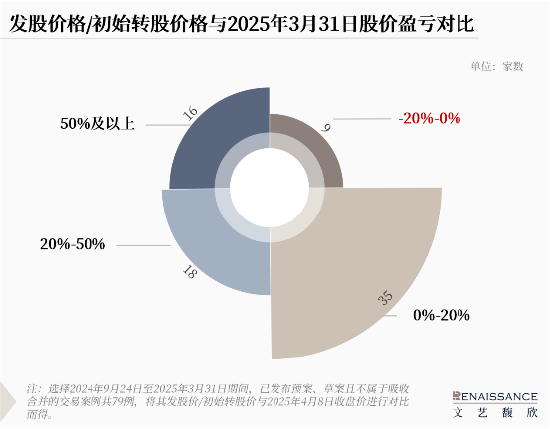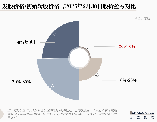 截至2025年6月30日,针对“并购六条”后已披露发股价的118起案例,对比发股价格/转股价格与当前股价的情况。