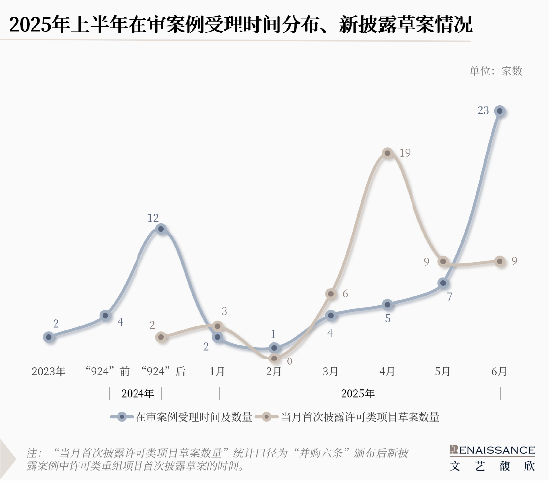 随着时间推移,不少交易走过了各方诉求的博弈、外部环境的变化的阶段,叠加4月份“年报季”的数据更新后,披露草案的案例也越来越多,交易所受理案例数量也在五六月份迎来了“并购六条”之后的第一波高峰。