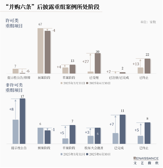 截至2025年6月30日,三大交易所受理的许可类重组项目共计60家次。其中,2025年以前受理的案例18家次,2025年上半年受理的案例42家次。