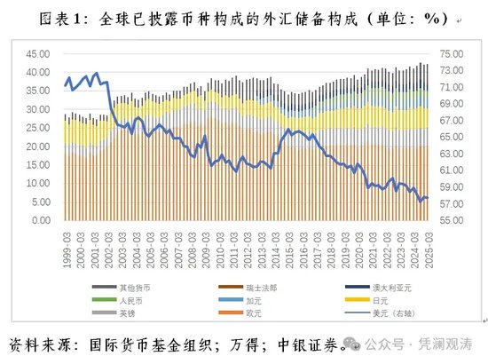 经历两轮“大水漫灌”后,国际社会开始进一步反思要减轻对单一货币的过度依赖,改革现行美元本位的国际货币体系。而2022年初俄罗斯遭遇包括被冻结外汇储备在内的西方联合金融制裁,加重了国际社会对于储备货币武器化和外汇储备资产安全性的担忧,这进一步加速了国际货币体系多极化的演进。2022年一季度至2025年一季度,美元储备份额累计下降1.06个百分点(见图表1)。