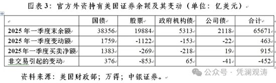 综上,截至今年一季度末,官方外资持有四大类美国证券余额合计65671亿美元,较上年末增加463亿美元。其中,净买入美国证券915亿美元,增长15.8%;非交易引起的官方外资持有美国证券余额减少453亿美元(见图表3)。