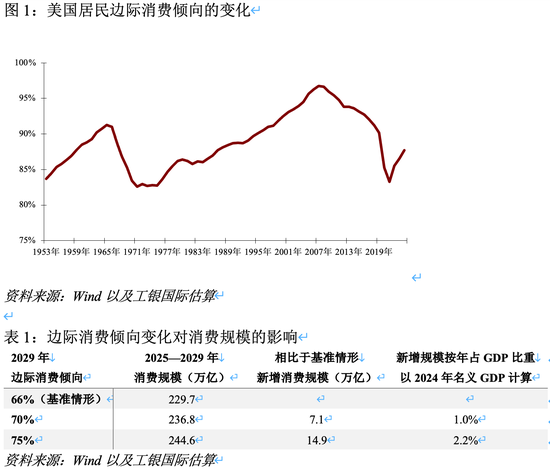 根据2000~2024年的数据进行回归分析,我们估算出目前中国居民的边际消费倾向在66%左右。相比之下,同时期美国居民的边际消费倾向接近88%。