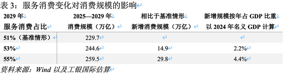 理论数值估算显示,以当前43%的服务消费占比为起点,若按照过去10年来的平均变化速度,服务消费占比将在2029年提升至51%,那么对应2025~2029年累计消费规模约为230万亿元;若以较快的变化速率将服务消费占比提升至53%或55%,则理论上可分别增加14.9万亿元与29.8万亿元,总体规模分别达到约245万亿元与260万亿元。