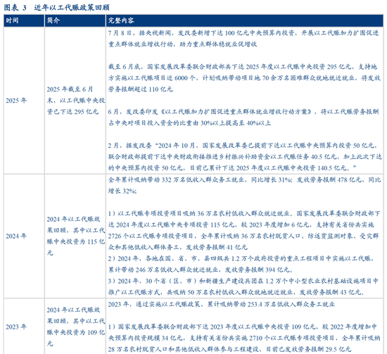 3)近期有何调整?当前主要是中央以工代赈投资力度明显增加,据发改委,“截至6月底,国家发展改革委联合财政部共下达2025年度以工代赈中央投资295亿元(分多批次下达)…预计吸纳带动70余万名困难群众就地就近就业”。这一数字较2024年的115亿元、36万人,明显增加。此外,6月发改委印发《以工代赈加力扩围促进重点群体就业增收行动方案》,将以工代赈劳务报酬占中央对项目投入资金的比重由30%以上提高至40%以上(2020年由10%提升至15%)。