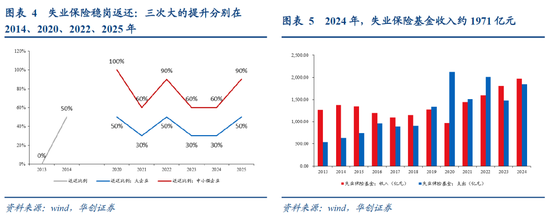 3)近期政策如何调整?2025年,返还比例再度调升20~30个百分点。2021年-2024年,失业保险稳岗返政策延续,但返还比例上限调整为大企业30%、中小微企业60%。2025年7月政策加力,在《关于进一步加大稳就业政策支持力度的通知》中,将大企业的返还上限从30%提升至50%,中小微企业从60%提升至90%。