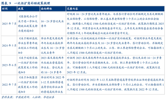 2)历史上,该政策有何变动?一次性扩岗补助可追溯至2022年,彼时“对招用毕业时间为2022年1-12月且取得普通高等学校毕业证书的普通高校毕业生…可以按每招用1人不超过1500元的标准发放一次性扩岗补助”,此后该政策一直延续,2025年,支持群体从“毕业年度及离校两年内未就业高校毕业生及16—24岁登记失业青年”调整为“16—24岁登记失业青年”,但补贴的对象从“企业”扩展为“企业和社会组织”,补贴标准未调整,均为1500元/人。