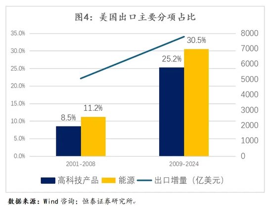 既然美国在贸易增量中的占比已从5.2%提升至9%以上,且国际收支状况向好,为何还要推行逆全球化、碎片化以及“小院高墙”等政策呢?2001年至2008年期间,美国经济增长及出口的主要驱动力来自制造业产品。在2009年至2024年期间,美国出口增量约为7000亿至8000亿美元,其中两类商品占比突出:一是高科技产品,二是能源产品,后者占比达30.5%,这部分增量源于美国能源革命(尤其是页岩气革命)的推动。然而,此类出口增长对就业的拉动作用有限,且蛋糕分配存在明显不均衡。