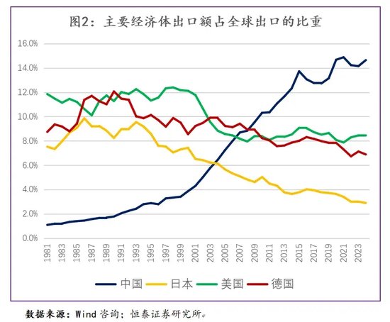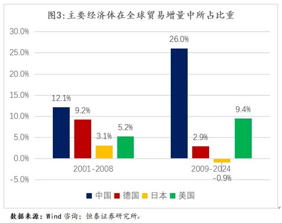在此过程中,我们可以发现一个颇为有趣的事实:在上一轮全球化(2001—2008年)的贸易增量中,中国占据了12.1%的份额,德国为9.2%,美国占5.2%。而自2009年起,当贸易全球化进程陷入停滞时,中国在贸易增量中的占比升至26.0%。值得注意的是,在此期间,美国在全球贸易增量中所占比重为9.4%,不仅高于其在全球化快速发展阶段的水平,亦显著超过德国2.9%和日本-0.9%的水平。反观日本,从2009年到2024年,其在全球贸易中的份额则出现了萎缩。