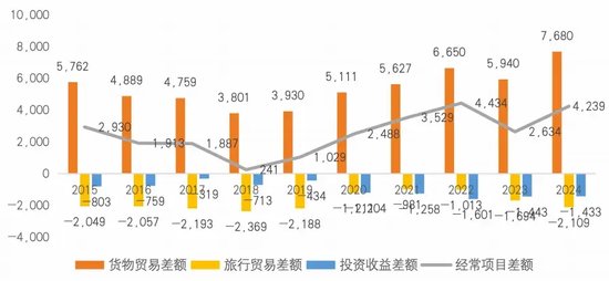 从2022年以来的数据看,我国经常项目顺差保持高位,2022年达到历史最高的约4400亿美元,2024年也达到约4200亿美元。货物贸易顺差2024年更是创下7680亿美元的历史新高。