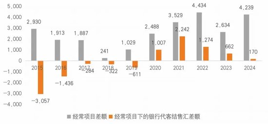 更值得关注的是结售汇数据。虽然2024年经常项目积累了4000多亿美元顺差,但银行代客结售汇顺差仅为170亿美元,只是经常项目顺差的零头。这说明大量进出口企业获得外汇收入后选择不结汇,不在外汇市场上增加外汇供给。