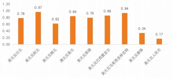 与其他主要国家货币相比,人民币和美元指数的相关性远弱于欧元、韩元、澳元等许多其他国家货币与美元的相关性。同样受到外部因素影响,其他国家货币与美元的相关性远高于人民币,特别是在资本项目开放程度较高、与国际金融市场融合度较高的经济体中。中国也受国际金融市场影响,但程度没有其他国家那么大。