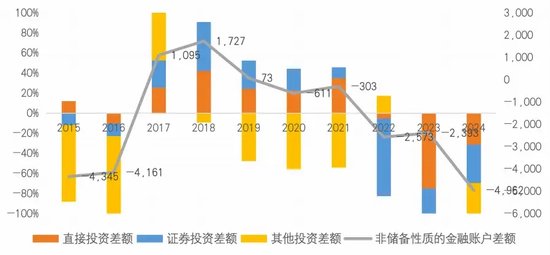 但在金融项目下,逆差较大且近年来显著扩大。非储备性质的金融项目主要包括了三个项目:直接投资、证券投资和其他投资。证券投资在2022年后逆差明显扩大,直接投资的资金净流出也显著放大。2024年证券投资和直接投资净流出分别达到1876亿美元和1537亿美元。虽然经常项目下有4000多亿美元顺差,但在金融项目下这些资金以各种形式流出,形成了多样化的海外金融资产。