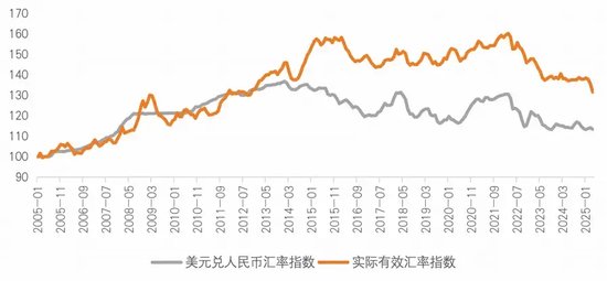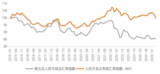 通过分解分析可以发现,实际有效汇率的变化取决于名义有效汇率变化和国内外价格水平变化。具体来看,人民币实际有效汇率从2022年到2025年下降15.4%,其中名义有效汇率的下降贡献了4.8个百分点,国内外相对价格水平变化贡献了10.6个百分点。