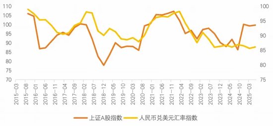 A股市场在一定程度上可被视为反映中国经济增长未来预期的指标。虽然不是完全一对一的对应关系,但A股相对而言能够在一定程度上反映资产收益预期。从相关数据可以看到,A股波动与人民币汇率同样呈现很高的相关性,当股票收益率上升的时候,人民币兑美元汇率走强;反之则走弱。