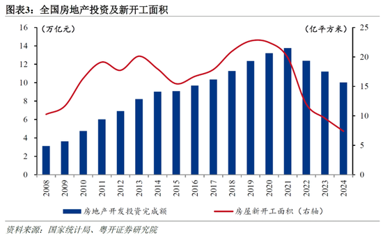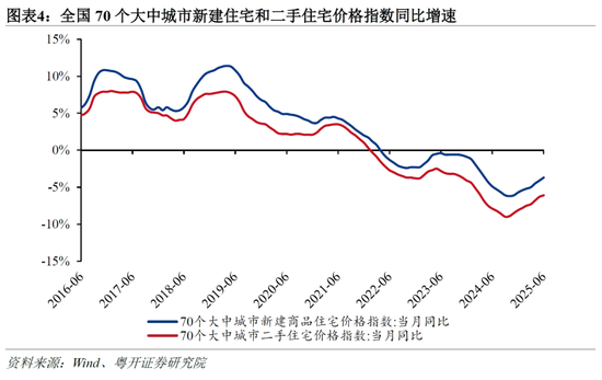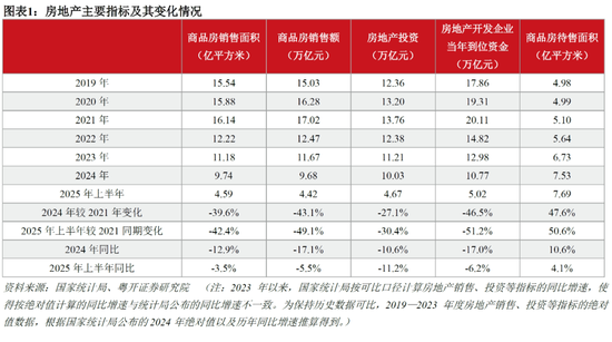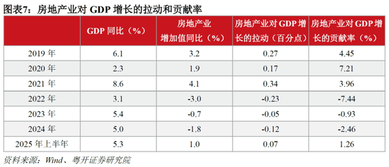 3、房地产对经济增长的贡献已由曾经的正向拉动转变为一种需要其他经济部门努力抵消和对冲的下行压力。从宏观数据看,房地产业增加值对GDP增长的拉动由正转负,2021-2024年分别为0.34、-0.23、-0.05、-0.12个百分点;虽然2025年上半年回升至0.07个百分点,但仍处历史低位,与其国民经济支柱产业的地位不符,房地产业增加值同比仅增长1.0%,低于GDP总体增速4.3个百分点。房地产投资下滑是固定资产投资的主要拖累项,2025年上半年同比下降11.2%,拖累固定资产投资增速2.4个百分点。