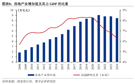 其一,房地产对GDP增长的作用从拉动转向拖累。房地产业增加值在2021年达到峰值的9万亿元,随后于2022—2024年连续三年下行,占GDP比重也从2020年高点的8.3%回落至2024年的6.3%。与此同时,房地产业对GDP增长的拉动也由正转负,2021-2024年分别为0.34、-0.23、-0.05、-0.12个百分点。虽然2025年上半年房地产业对GDP增长的拉动回升至0.07个百分点,但仍处历史低位,与其国民经济支柱产业的地位不符,房地产业增加值同比仅增长1.0%,低于GDP总体增速4.3个百分点。