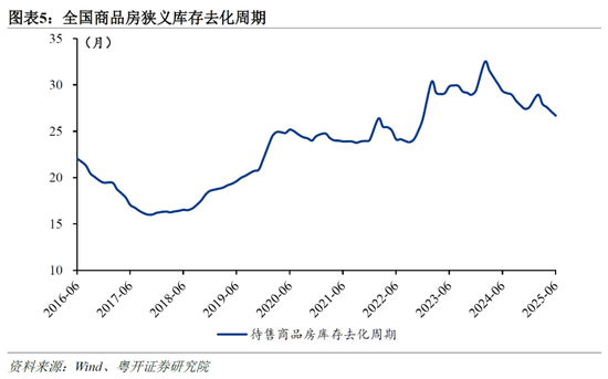 其四,全国商品房可售库存仍处高位,狭义库存去化周期略有回落。2025年6月末,全国待售商品房面积7.69亿平方米,创历史同期新高,同比增长4.1%;狭义库存去化周期为26.7个月,较去年32.5个月的峰值有所下降,但仍处高位。其中,住宅的库存去化好于其他类型商品房,6月末商品住宅狭义库存去化周期为19.0个月。部分核心城市购房需求修复,带动可售住宅库存去化加快,但其他城市库存压力仍高。根据中指研究院统计,青岛、福州、南京等二线城市可售住宅库存压力较高,去化周期超20个月;广州、武汉、合肥等城市去化周期处于12—20个月之间,而上海、杭州等城市住宅库存去化周期已缩短至7个月左右。