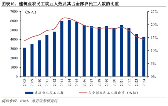 其三,房地产直接或间接吸纳大量就业人口,房地产持续调整对农民工群体就业冲击尤为明显。房屋建筑业属于劳动密集型产业,建筑业是吸纳城镇就业人员的第三大行业。2021—2024年间,建筑业农民工数量累计减少近1300万人;2024年末,全国从事建筑业的农民工数量约4300万人,建筑业农民工占全部农民工人数的比重仍高达14.3%。此外,房地产调整还可能通过上下游传导至家具、建材等制造业,使其企业经营压力加大,对相关行业就业形成冲击。