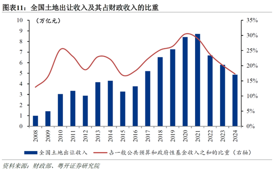 其四,土地出让收入规模持续萎缩,影响地方财政收入和能力。过去房地产市场快速发展,土地出让收入快速上升,“土地财政”不仅补充地方政府收入,还通过财政支出、政府投资等方式支持城市基础设施建设。2021年,全国土地出让收入达8.71万亿元,创历史高点,土地出让收入相当于一般公共预算与政府性基金预算收入之和的比重(简称为“土地财政依赖度”)达35.9%。2022年以来,伴随房地产市场持续调整,土地出让收入连续三年下行,2024年土地出让收入为4.87万亿元,全国土地财政依赖度下降至17.3%;2025年上半年,全国国有土地使用权出让收入1.43万亿元,相当于2021年同期高点的41.4%。土地出让收入规模持续萎缩,可能造成地方政府可用财力减少,地方财政支出发力空间受限。