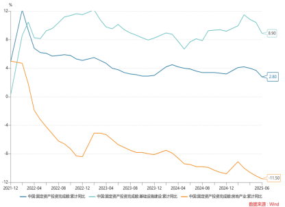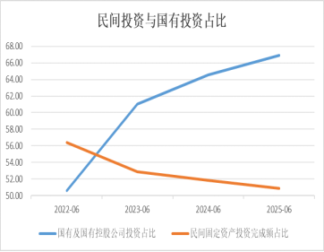 近年来,我国民间固定资产投资占比持续下滑,而国有及国有控股固定资产投资占比持续上升,民间投资与国有投资比重呈现K型发散结构。2025年上半年,我国国有及国有控股企业固定资产投资同比增长5%,而民间投资累计下降0.6%,民间固定资产投资占比更是进一步下降至50.88%,较2022年同期下降明显。