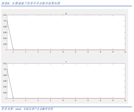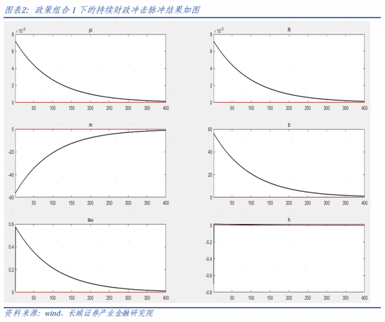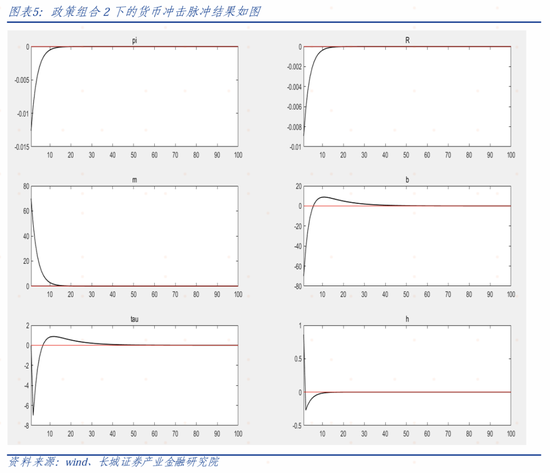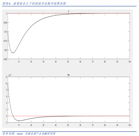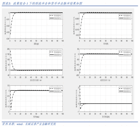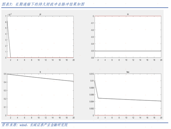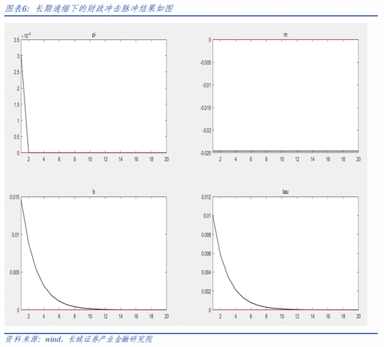 如果我们比较财政冲击和货币冲击,可以发现赤字货币化会让通胀大幅增加。(系统中的货币冲击是指利率上升,而赤字货币化对应的是利率降息,所以𝜋𝑡会大幅上升)这就证实了在财政政策占主导的情境下,被动的货币政策会让通胀大幅上行,验证了FTPL理论的存在。