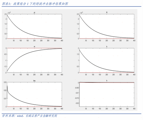 从上图可以看出,财政冲击对𝑅𝑡、𝑚𝑡、𝜋𝑡几乎没有影响,这正好反映了李嘉图等价理论的内容。由于货币反应系数较高,控制住了通胀,对冲了财政冲击。而财政反应系数也较高,让减税的影响很快消失掉。