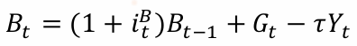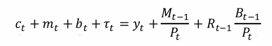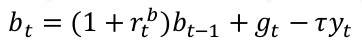 其中,𝐵𝑡和𝑏𝑡为名义债券量和实际债券量,𝑅𝑡为总无风险回报率,𝜏𝑡为人均税负。